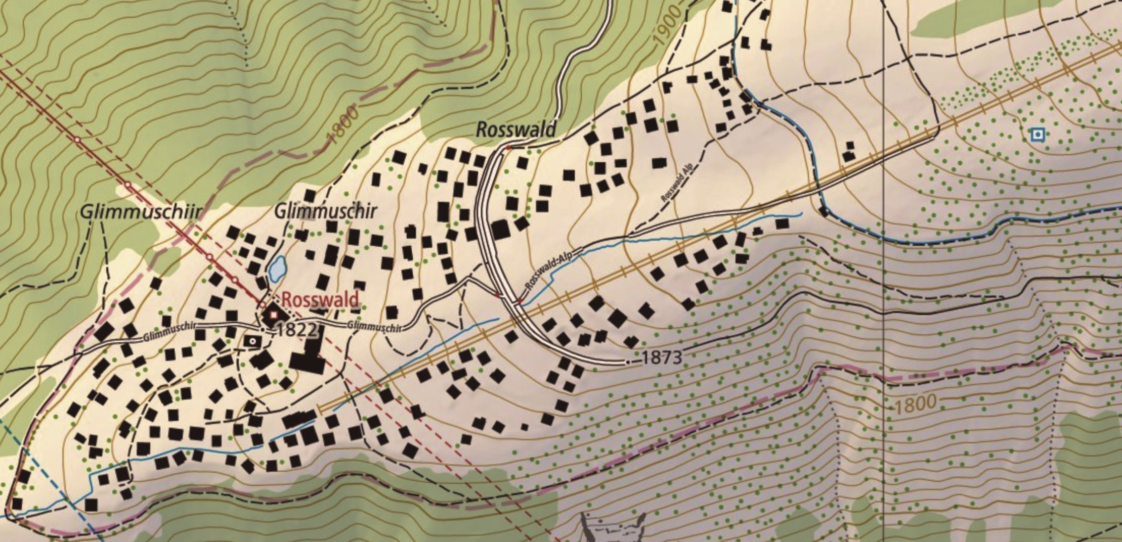 Die 4.5-Zimmer-Dachwohnung ist 3 Gehminuten von der Seilbahn Bergstation Rosswald entfernt. Im Dorf hat es Einkaufsläden, Sportgeschäfte und Restaurants.